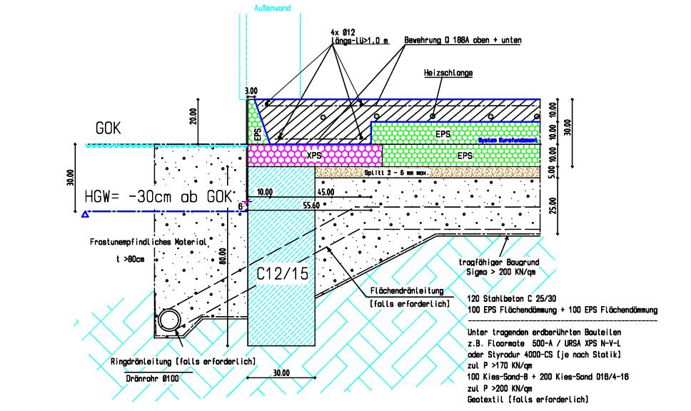 wir werden in 6 Wochen anfangen zu bauen, Einfamilienhaus, 2 Vollgeschosse. Ich möchte unter der Bodenplatte dämmen, da aber Streifenfundamente im vorderen Bereich drunterkommen, weiß ich nicht so genau wie. Die Streifenfundamente selbst wollte ich eigentlich nicht dämmen, damir das zu teuer ist. Ich habe hier ein Skizze bekommen von der Fa. Eurofundament, die Art der Dämmung gefällt mir ganz gut, nur bitte die Heizschlangen im Estrich vergessen, werde ich nicht so machen. Bodenplatte selbst wird 20 cm dick. Gibt das Probleme zwischen Platte und Streifen zu dämmen?